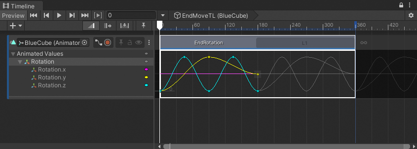 _The `EndRotation` clip loops once, indicated by L1. Its animation curve loops and is drawn in white._