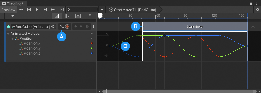 **(C)** The trimmed keyframe animation displays outside of the Animation clip.