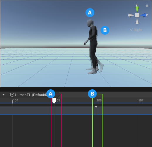 _The `DefaultMale` jumps between the `TurnLeft` Animation clip, which ends at frame 105 (A), and the `Walk` Animation clip, ghost model which starts at frame 106 (B)_