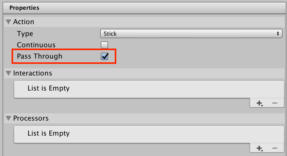 - Actions have a new pass-through mode. In this mode an action will bypass any checks on control actuation and let any input activity on the action directly flow through. See the documentation for details.