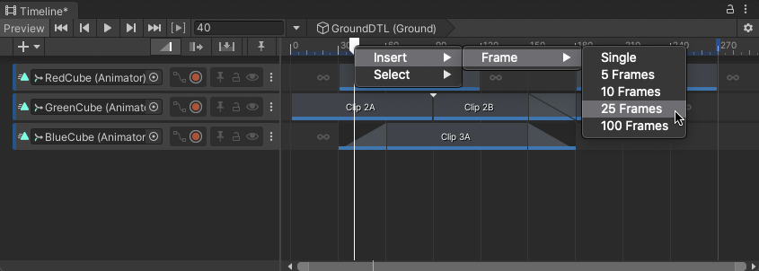- Right-click the Timeline Playhead on the Timeline ruler above the Content view, select Insert > Frame, and a number of frames.