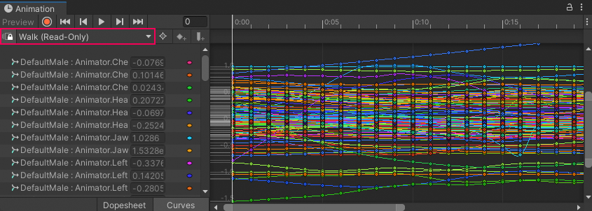 Use the Curves view to view and edit animation curves for audio tracks, infinite clips, and animation clips. The Curves view is similar to Curves mode in the Animation window.